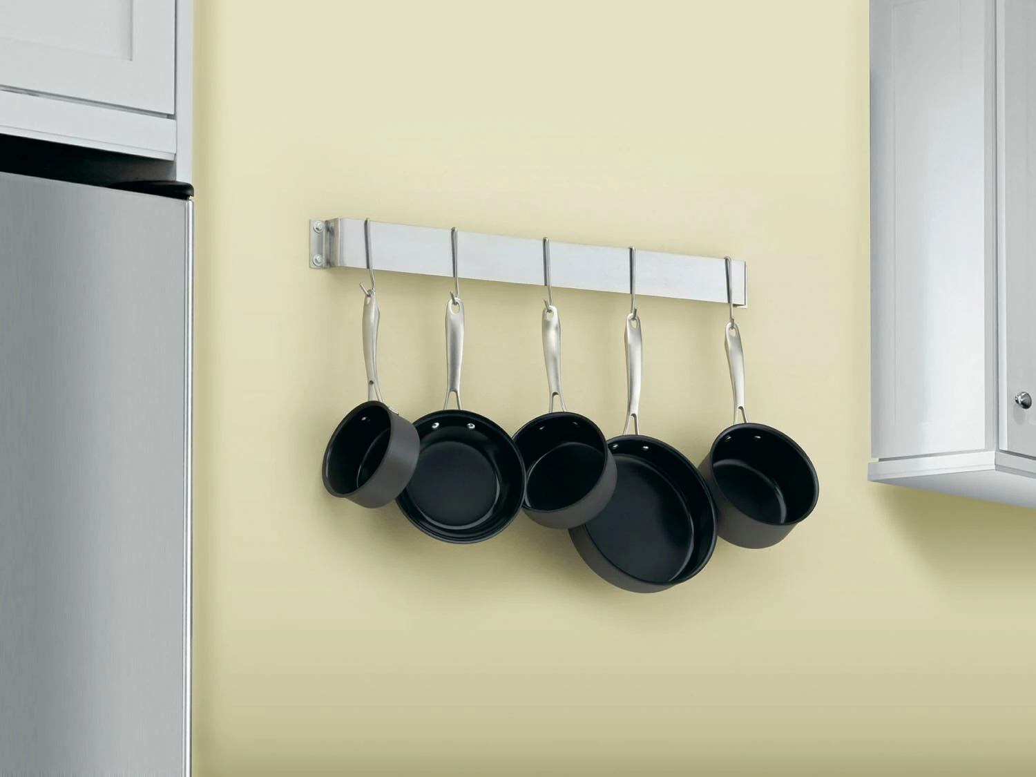 The Cuisinart CRBW-33B 33-Inch Bar Wall Rack in Brushed Stainless offers easy storage of cookware. The bar rack’s sleek profile makes it easy to fit into any kitchen space, large or small. A set of six universal pot rack hooks compatible with any Cuisinart cookware rack are available separately. The contemporary brushed finish complements any decor, making this a great gift for any kitchen enthusiast, newlywed, or new home owner.