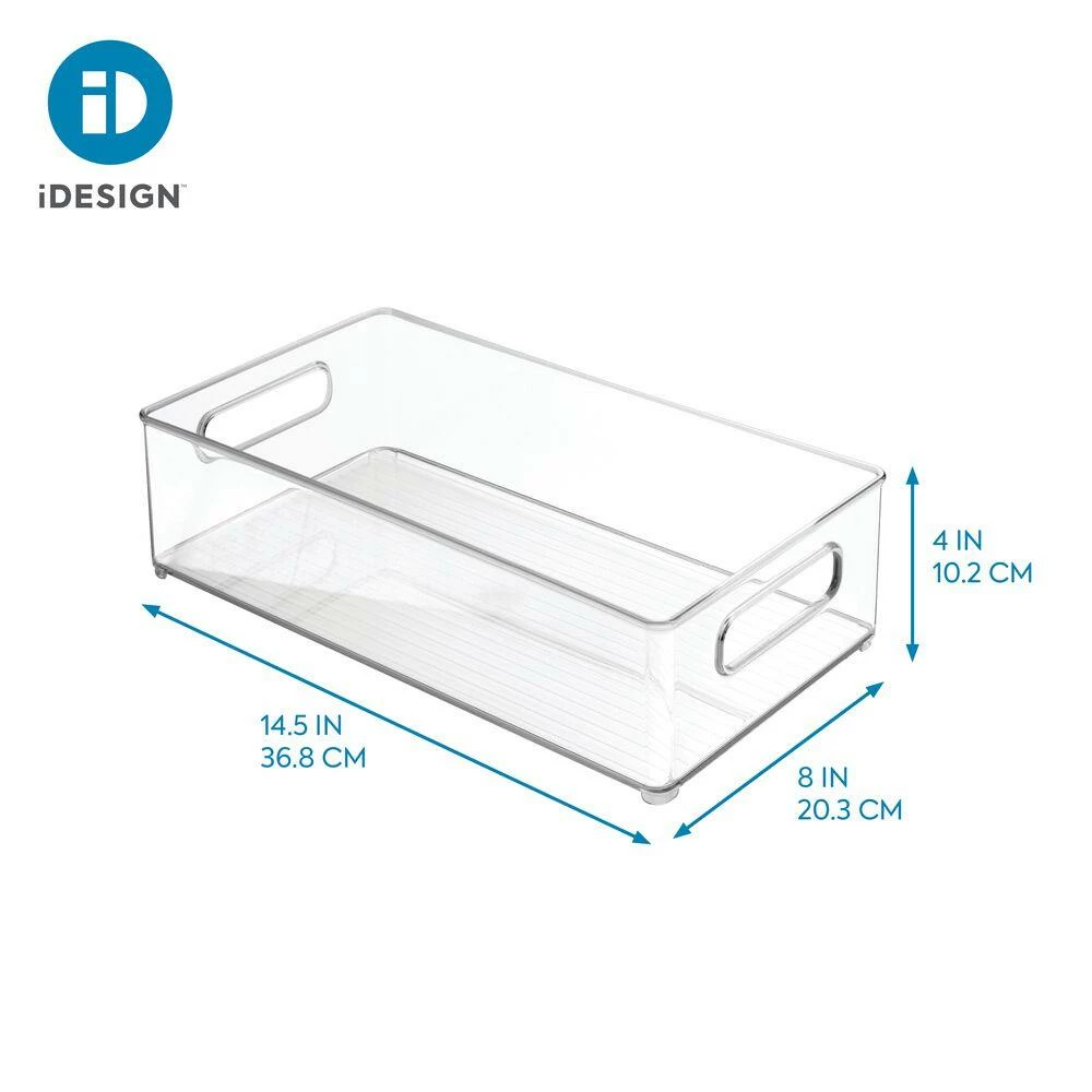 Upgrade your kitchen storage with the iDesign + The Spruce kitchen bins. This longer-length wide bin provides better storage for your foods and items. The see-through sides and open-top lets you keep an eye on what’s inside, while built-in handles let you organize and reorganize on the move. Want to customize your storage? This modular organizer easily stacks on top of one another and pairs with other bins in the collection (sold separately). Use it in the kitchen, the bedroom, the office, or anywhere else that needs rearranging. This bin’s functional versatility, coupled with a sleek and modern design, will help it blend into any decor. It’s easily cleaned with soap and water. Made with durable plastic. And measures at a compact 8″ x 4″ x 14.5″. This bin, with some help from iDesign + The Spruce, will let you live simply, every day.