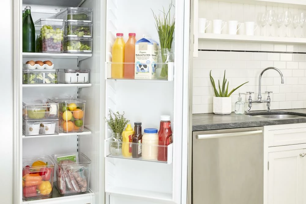 - Wide, longer-length design creates instant organization in the refrigerator, freezer, or pantry for fruit, vegetables, bottles, cans, boxes, pouches, snack bags, and more