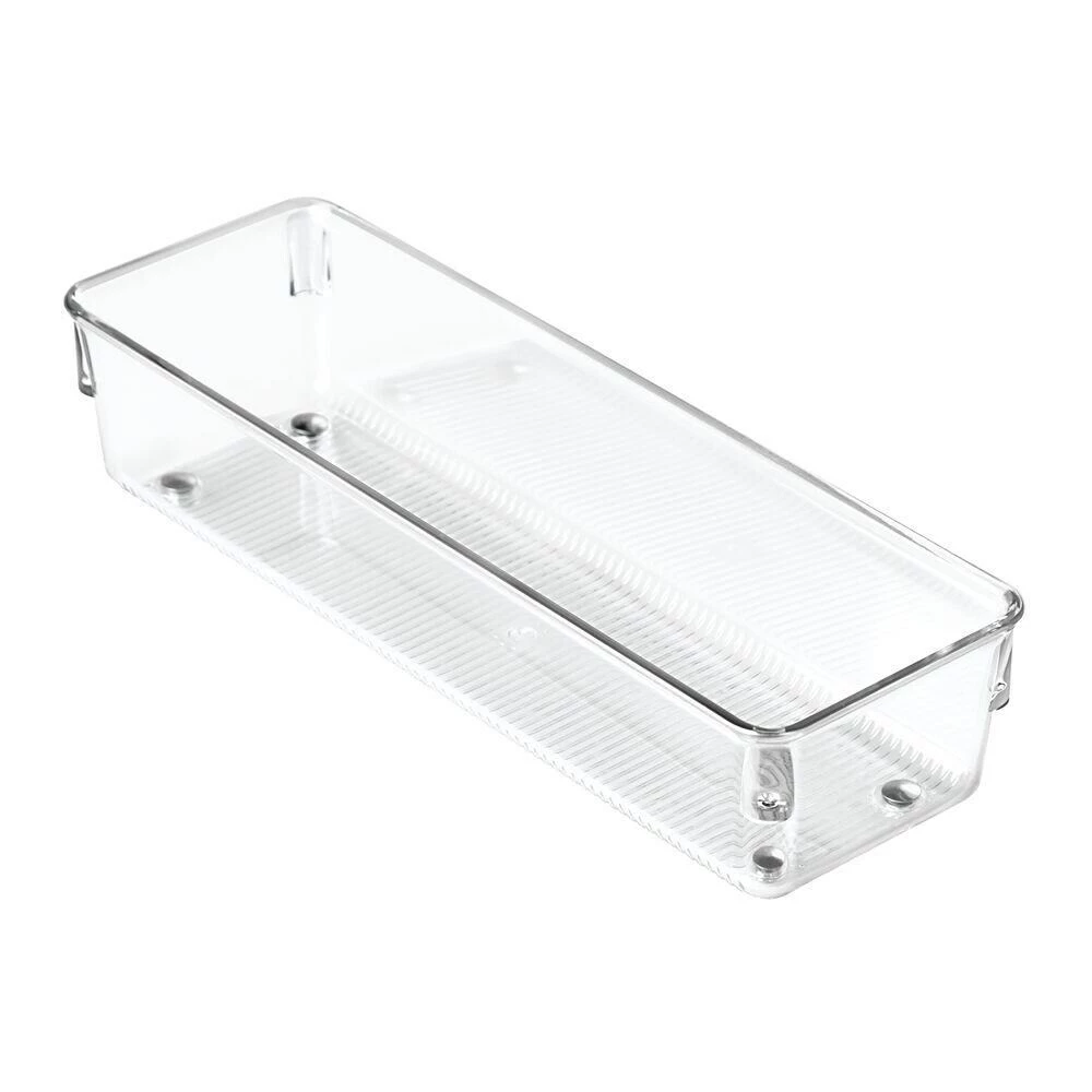 Make the most of any space with the iDesign + The Spruce drawer organizer tray. This versatile tray provides convenient storage for utensils, gadgets, flatware, and more. The see-through sides and open-top help you keep an eye on what’s inside, while the four non-skid feet prevent the tray from sliding when in use. Want to customize your storage? This modular organizer easily pairs with other trays in the Linus collection (sold separately). Use it in the kitchen, the bedroom, the office, or anywhere else that needs rearranging. This tray’s functional versatility, coupled with a sleek and modern design, will help it blend into any decor. It’s easily cleaned with soap and water. Made with durable plastic. And measures at a compact 3″ x 9″ x 2″. This tray, with some help from iDesign + The Spruce, will let you live simply, every day.