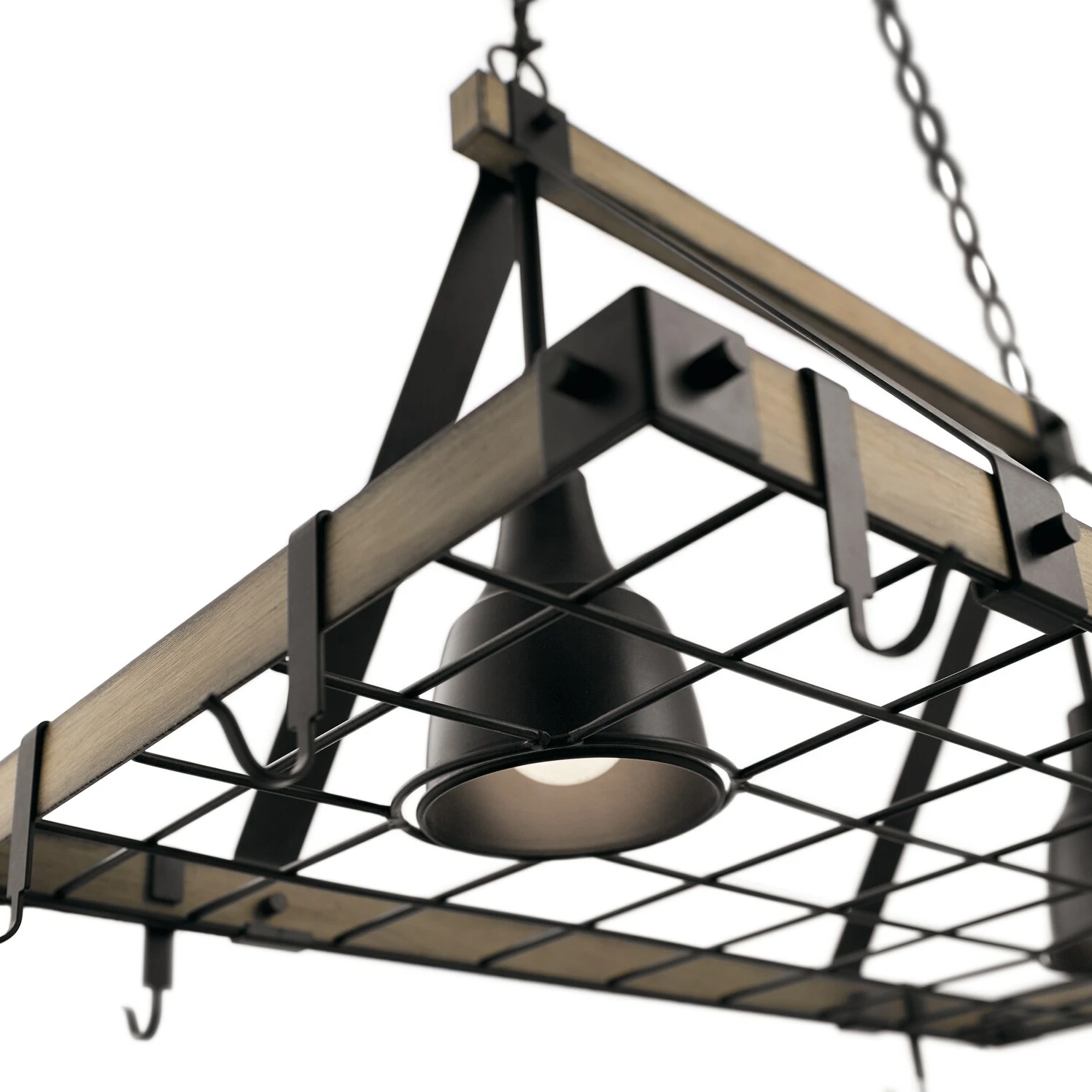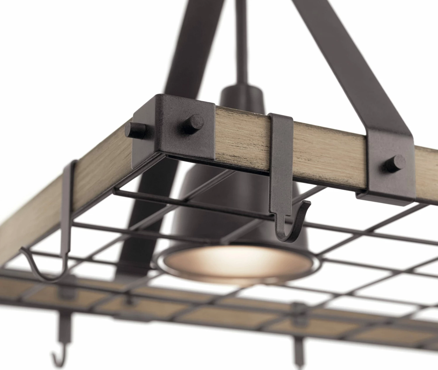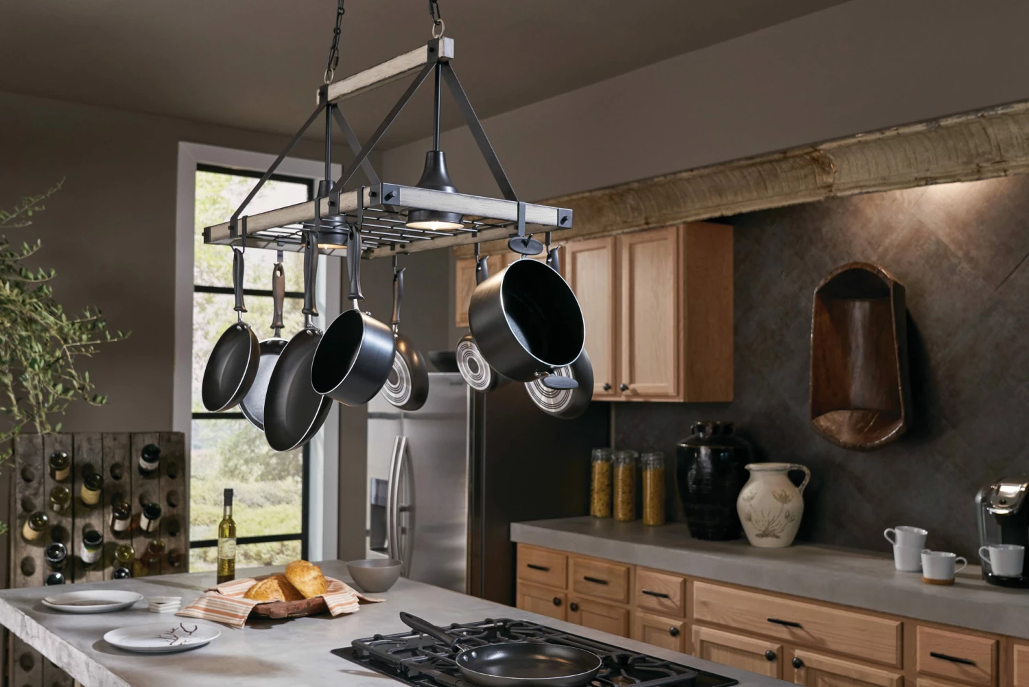 - Anvil iron and driftwood tone finish linear pot rack from the Barrington collection