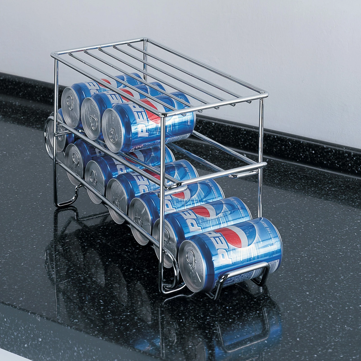 Maximize your space in your refrigerator or pantry with the Neu Home can organizer storage rack. A smart and convenient design of 2 tier sturdy metal rack with open face design that allows you to easily store your soda cans or canned goods and safely remove when needed. Holding up to 12 standard size cans the space saving design automatically frees up wasted space. Acts as both a storage for cans and a dispenser.