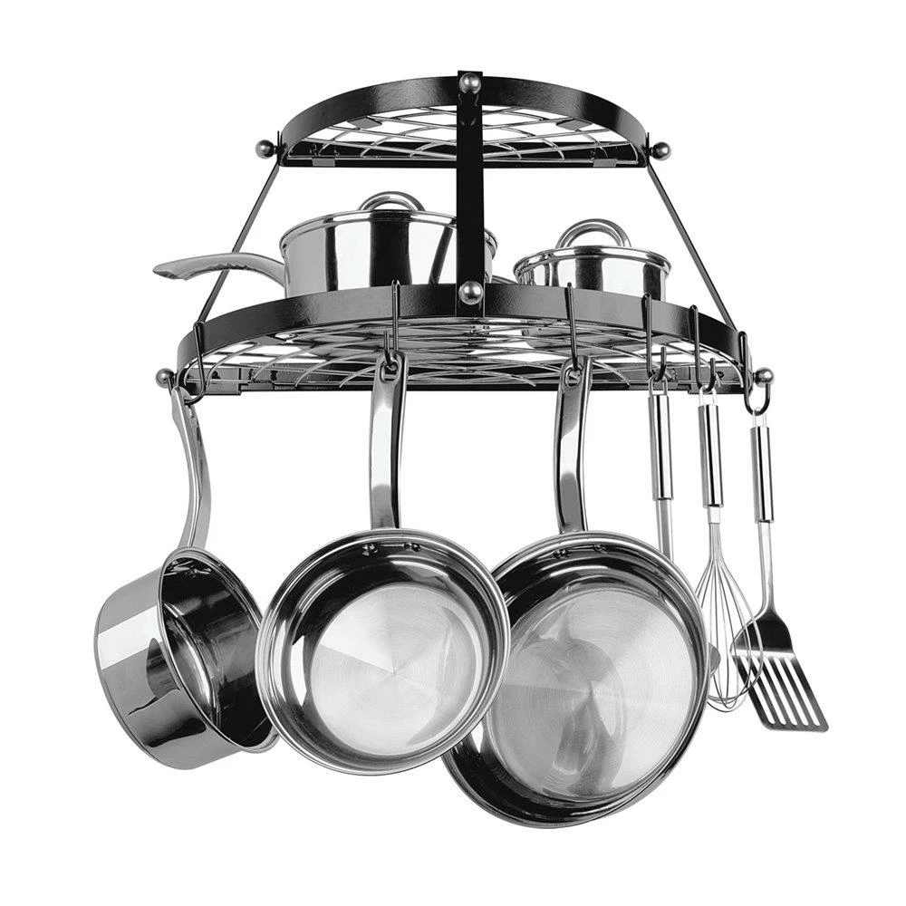 Designers agree, pot racks are the perfect solution for kitchen decor and storage. This attractive black enamel coated metal pot rack is wall mounted with two shelves and repositionable hooks to stylishly maximize your kitchen space. Holds up to 30lbs. minimal assembly required.