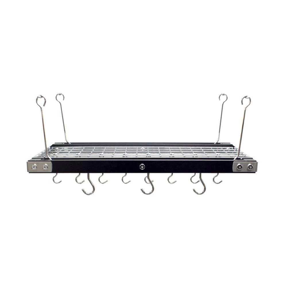 Walnut pot rack with black finish. Easily solve storage and organization problems while adding decor. Perfectly suited to current trends, using modern elements with traditional. Attractive stainless steel accents. Holds up to 40 lbs. Minimal assembly required.
