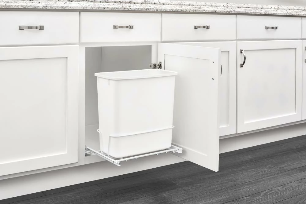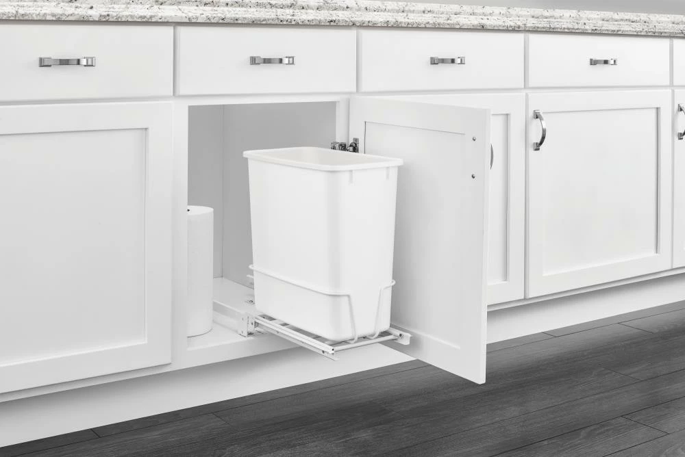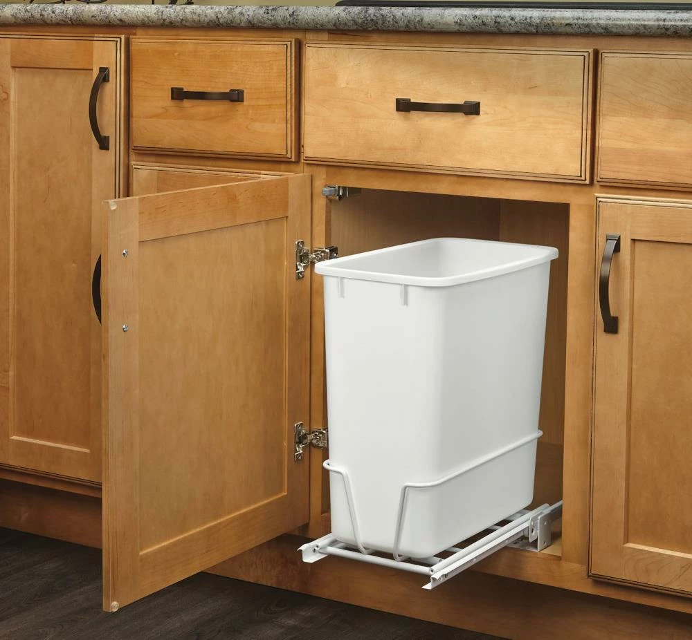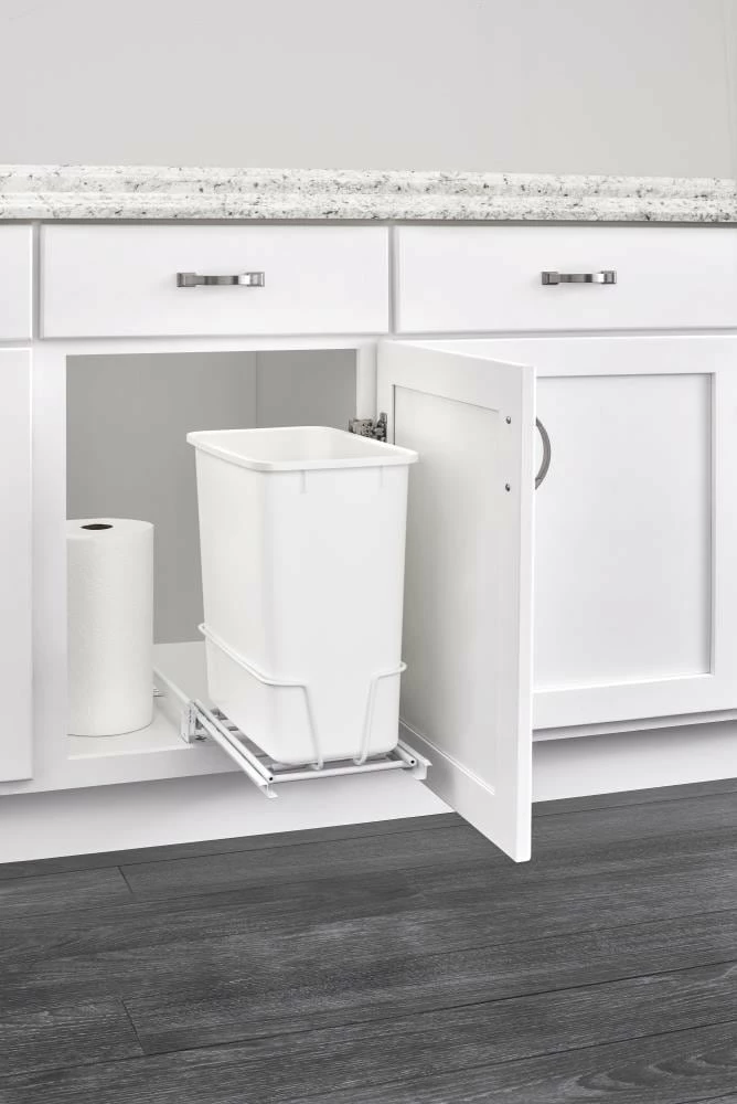 Rev-A-Shelf’s pull out trash can clears your kitchen of trash by hiding it inside your cabinet. Can be turned in either direction to avoid plumbing and other obstructions.