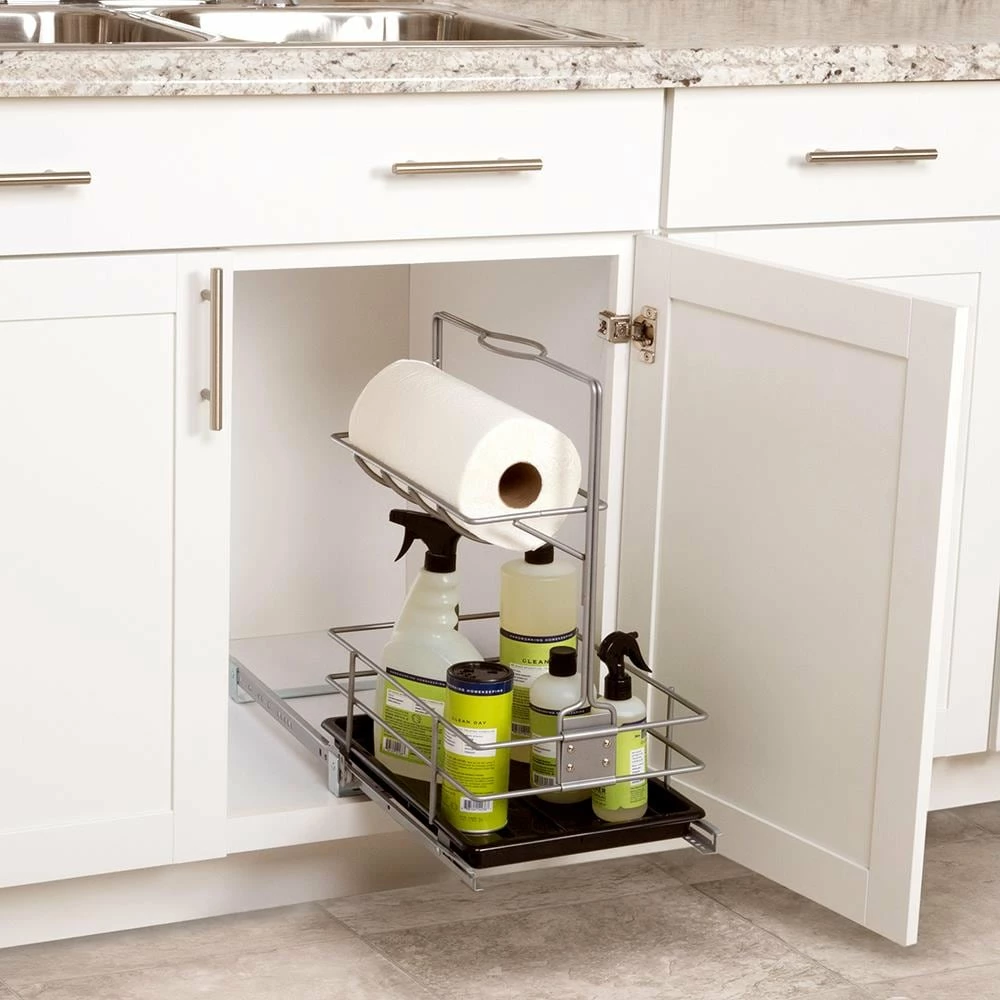 Cleanup is simple when you take along this under-cabinet removable cleaning caddy. Just detach from the mounted slide system and go. Pullout basket stores all your cleaning supplies; easy-to-clean bottom tray catches drips and spills. Paper towel holder on top mounts on the left or right to accommodate plumbing. Installs easily with tape measure, drill and included hardware.