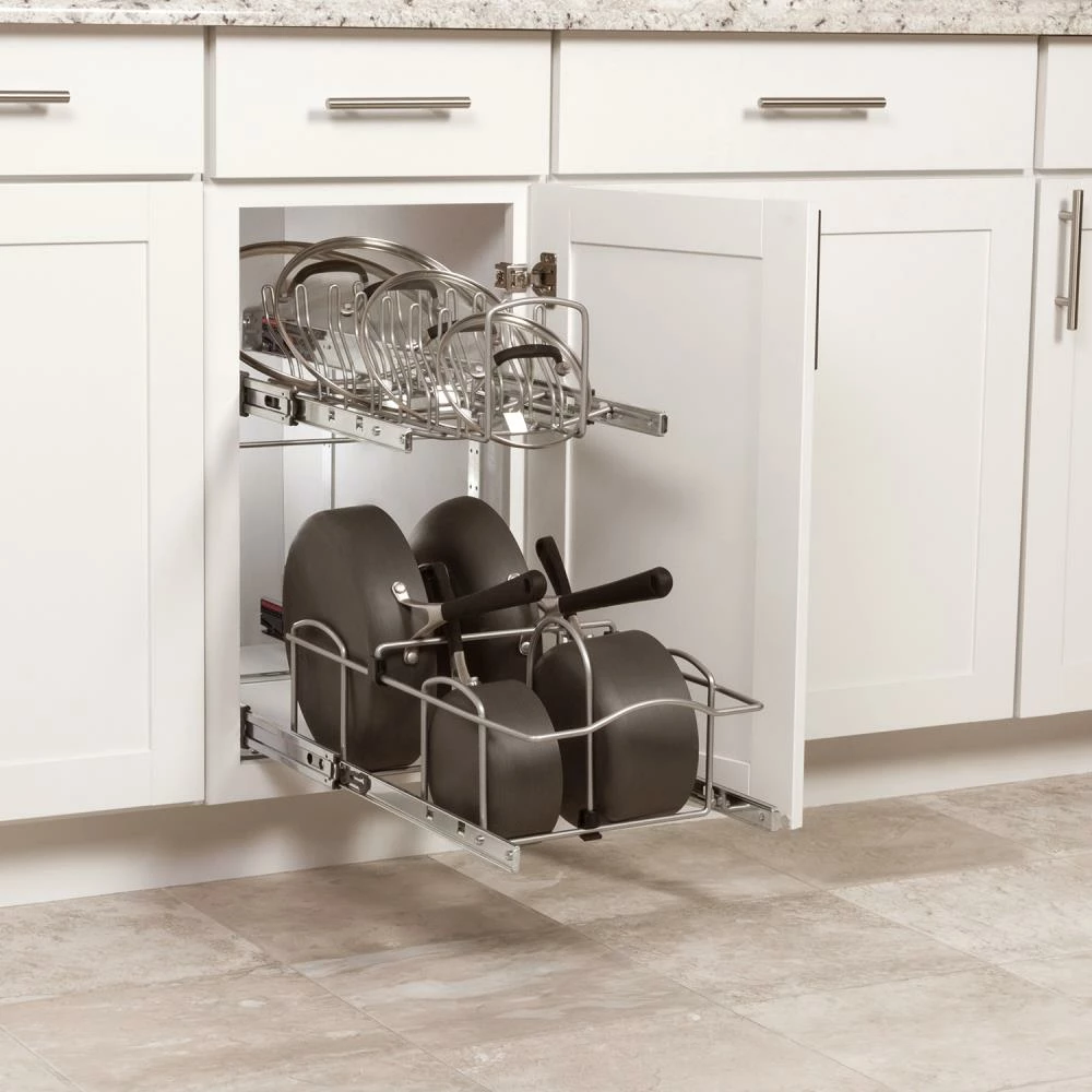 Calm the chaos in your kitchen, bathroom, or laundry with our Simply Put 11-inch double-tier soft-close pull-out cookware organizer. This simple project is easy to install and comes with all necessary hardware. Upper and lower racks open smoothly, and close softly, sliding out independently for easy access to cookware. Adjustable dividers help accommodate various sizes of pots, pans, lids, and more.