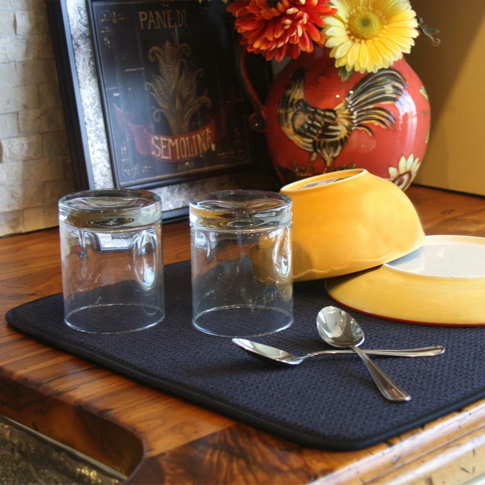 The microfiber dish drying mats are the new solution to the age old tradition of placing dish towels on the counter when hand-washing pots, pans, dishes, and glassware. Our dish drying mat features a center layer of foam that is fused to revolutionary, super-absorbent microfiber fabric using our proprietary manufacturing process. This process yields a mat that is highly functional and incredibly durable, use after use, wash after wash. By combining an optimal foam thickness with uniquely woven microfiber fabric, water quickly radiates from the point of contact, enhancing absorption and quickening drying time. You will be amazed by the effectiveness and convenience of this deceptively simple item! The microfiber dish drying mat is perfect for use underneath a dish rack to catch drips or you can place pots, pans, and glassware directly on the mat. You can even set it under small appliances to protect your counter from scratches and scuffs. Caring for your dish drying mat is easy; simply toss it in the washing machine with cold water and a liquid detergent and then place in the dryer on a low heat setting.