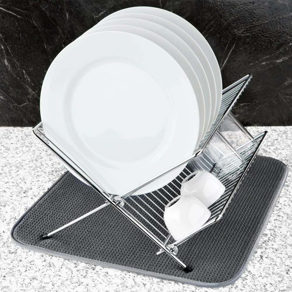 The microfiber dish drying mats are the new solution to the age old tradition of placing dish towels on the counter when hand-washing pots, pans, dishes, and glassware. Our dish drying mat features a center layer of foam that is fused to revolutionary, super-absorbent microfiber fabric using our proprietary manufacturing process. This process yields a mat that is highly functional and incredibly durable, use after use, wash after wash. By combining an optimal foam thickness with uniquely woven microfiber fabric, water quickly radiates from the point of contact, enhancing absorption and quickening drying time. You will be amazed by the effectiveness and convenience of this deceptively simple item! The microfiber dish drying mat is perfect for use underneath a dish rack to catch drips or you can place pots, pans, and glassware directly on the mat. You can even set it under small appliances to protect your counter from scratches and scuffs. Caring for your dish drying mat is easy; simply toss it in the washing machine with cold water and a liquid detergent and then place in the dryer on a low heat setting.