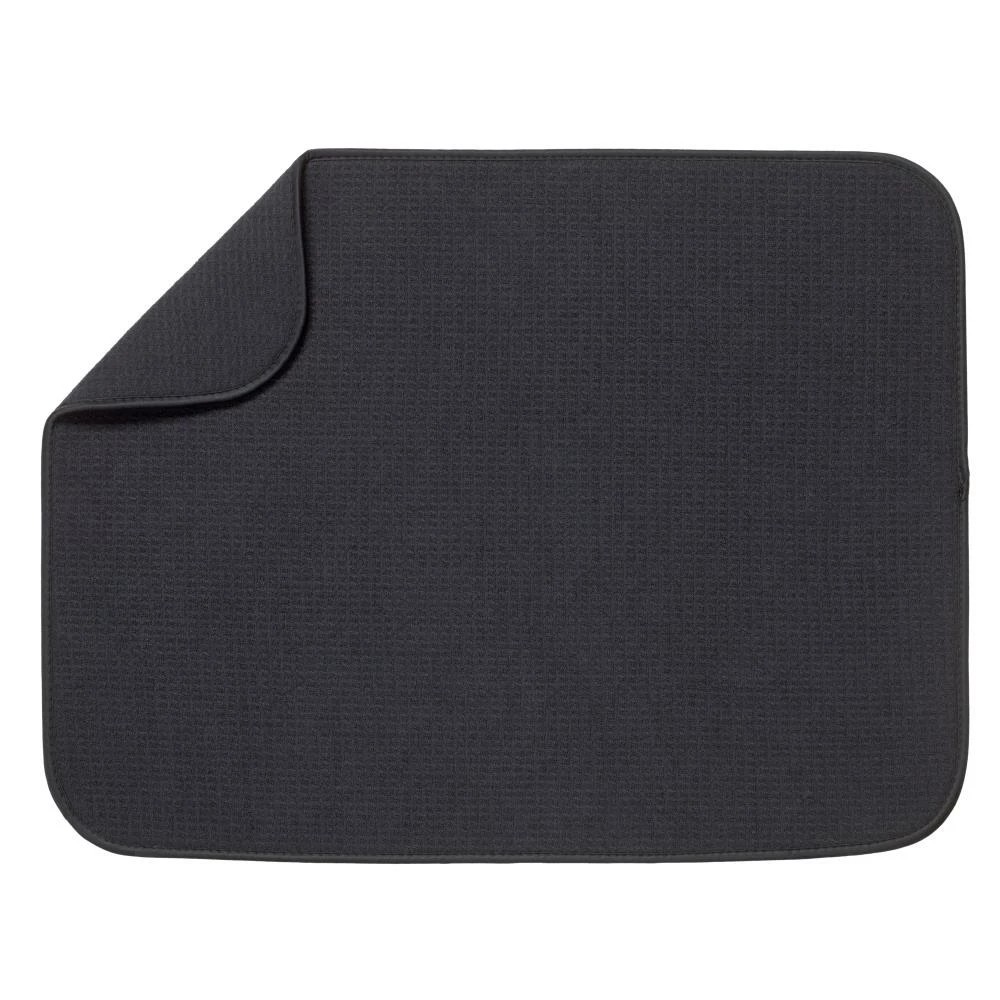 The Style Selections XL microfiber dish drying mats are the new solution to the age old tradition of placing dish towels on the counter when hand-washing pots, pans, dishes, and glassware. Our dish drying mat features a center layer of foam that is fused to revolutionary, super-absorbent microfiber fabric using our proprietary manufacturing process. This process yields a mat that is highly functional and incredibly durable, use after use, wash after wash. By combining an optimal foam thickness with uniquely woven microfiber fabric, water quickly radiates from the point of contact, enhancing absorption and quickening drying time. You will be amazed by the effectiveness and convenience of this deceptively simple item! The XL microfiber dish drying mat is perfect for use underneath a dish rack to catch drips or you can place pots, pans, and glassware directly on the mat. You can even set it under small appliances to protect your counter from scratches and scuffs. Caring for your dish drying mat is easy; simply toss it in the washing machine with cold water and a liquid detergent and then place in the dryer on a low heat setting.