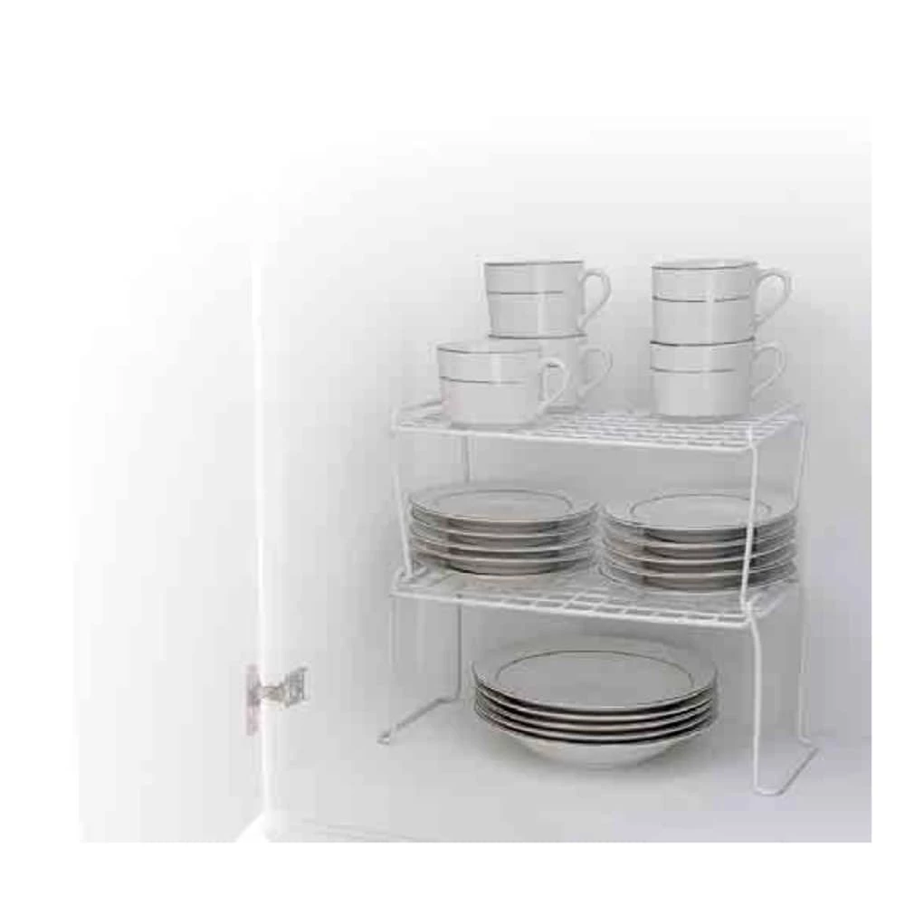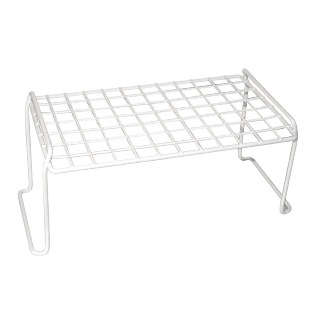 Customize your kitchen, bath or utility space with this stackable shelf. Each unit can be added and interlocked with another to stack. This item is specially coated with a soft, white plastic to help prevent scratches to dishes and to enhance rust-resistance for the unit.