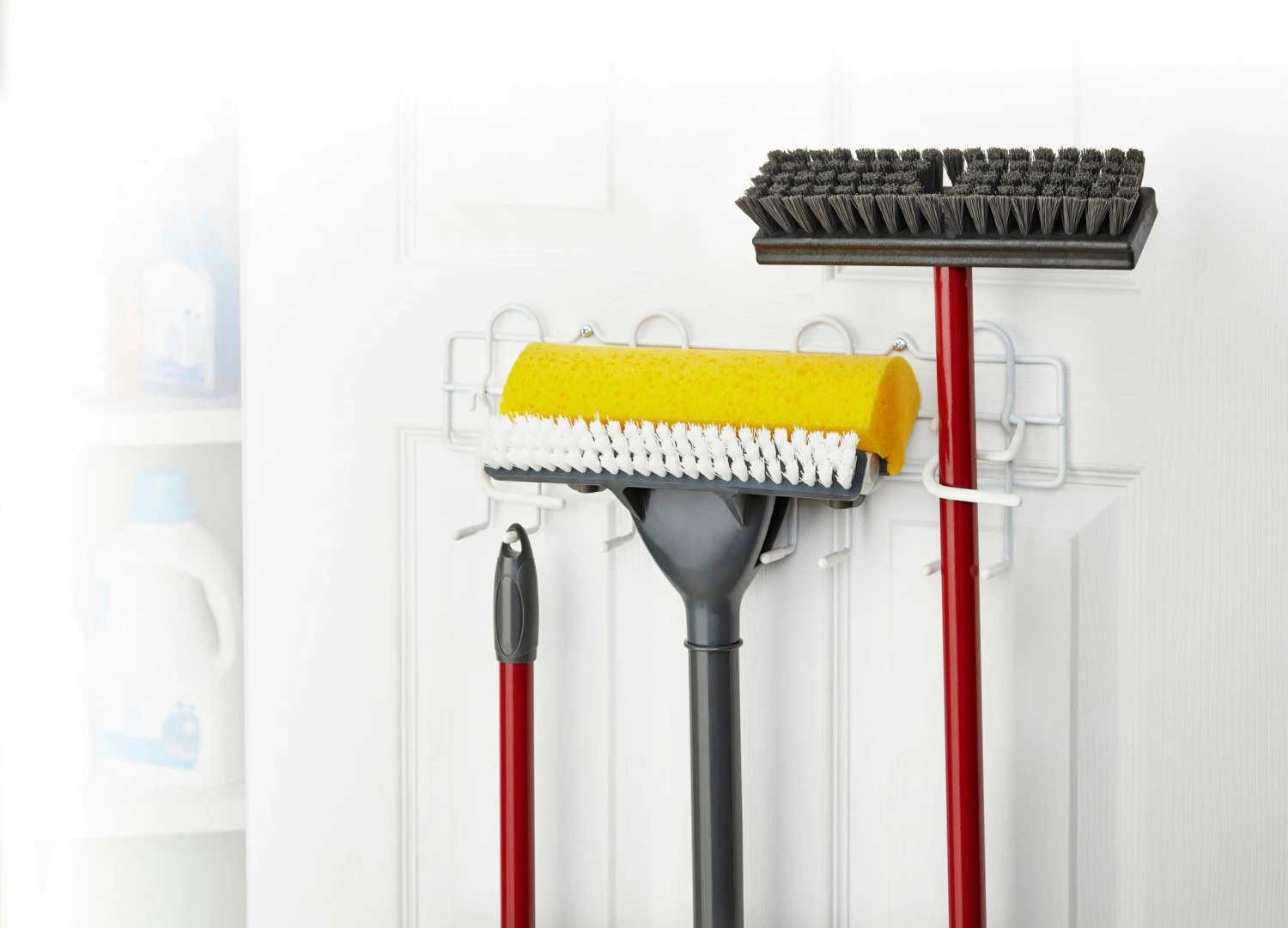 - Holds brooms, mops and dustpans