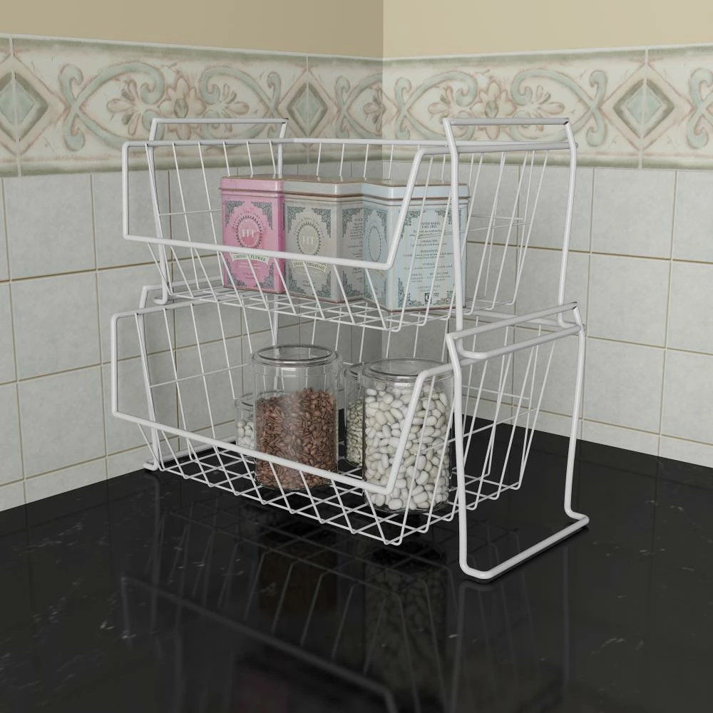 Customize your kitchen, bath or utility space with this large wire basket. Each unit can be added and interlocked with another to stack. This item is specially coated with a soft, white plastic to help prevent scratches to dishes and to enhance rust-resistance for the unit.