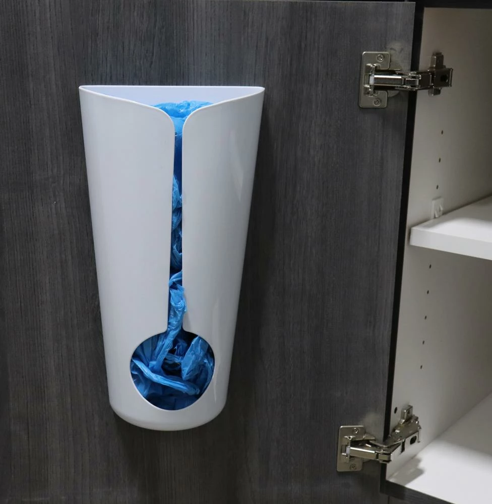 So many things, so little space. The cabinet and wall mount plastic recycling bag holder solves a portion of the never ending challenge of organization in your kitchen and pantry. It servers double duty, storing and dispensing bags.