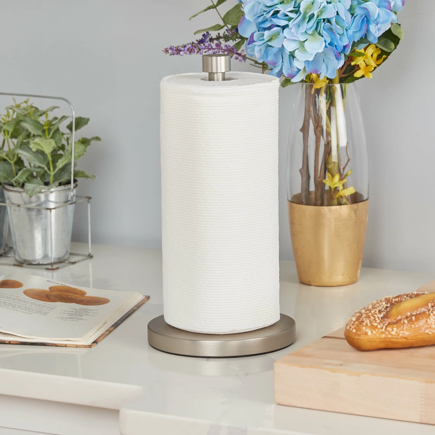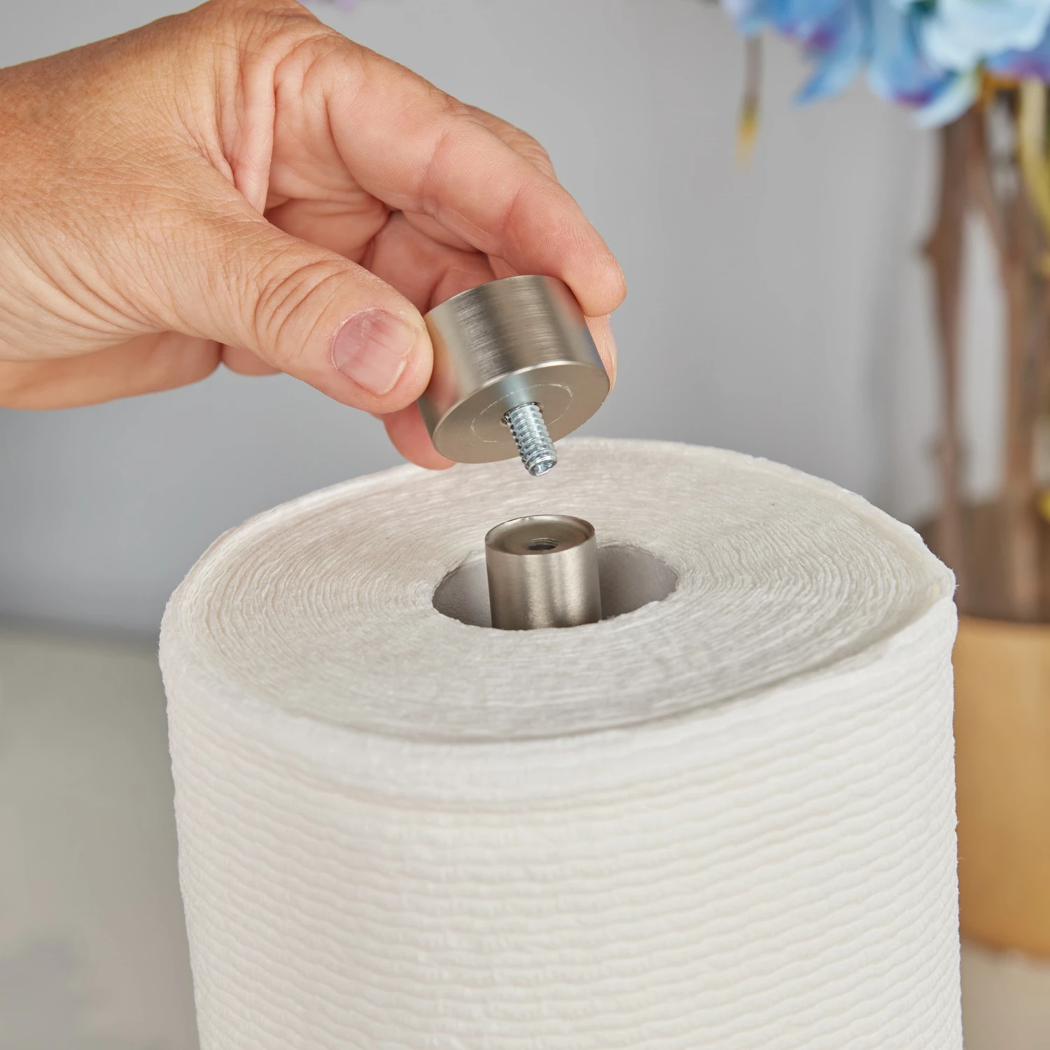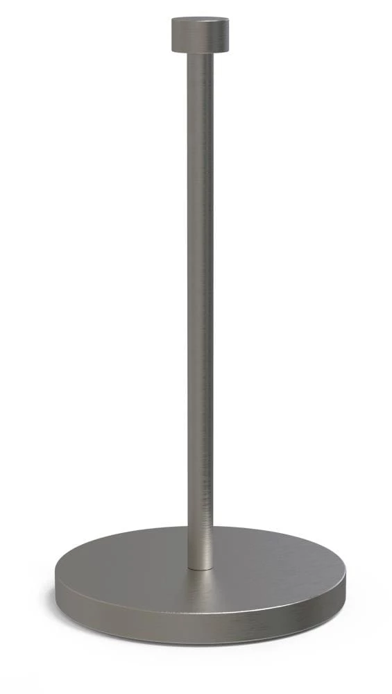 Capulet paper towel holder is elegant and refined in form, featuring a brushed-nickel finish, narrow shaping. Constructed of cast-metal.